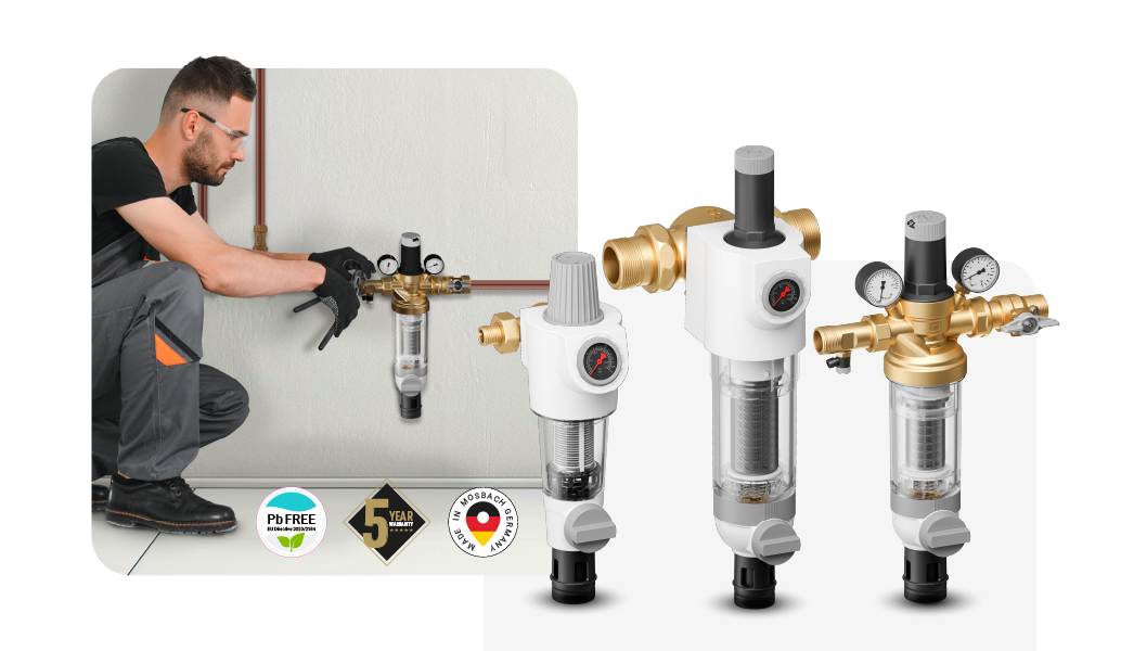 Filtru cu spălare inversă cu reductor de presiune integrat. Opțiunea de curățare automată poate fi prevăzută pentru mai mult confort.